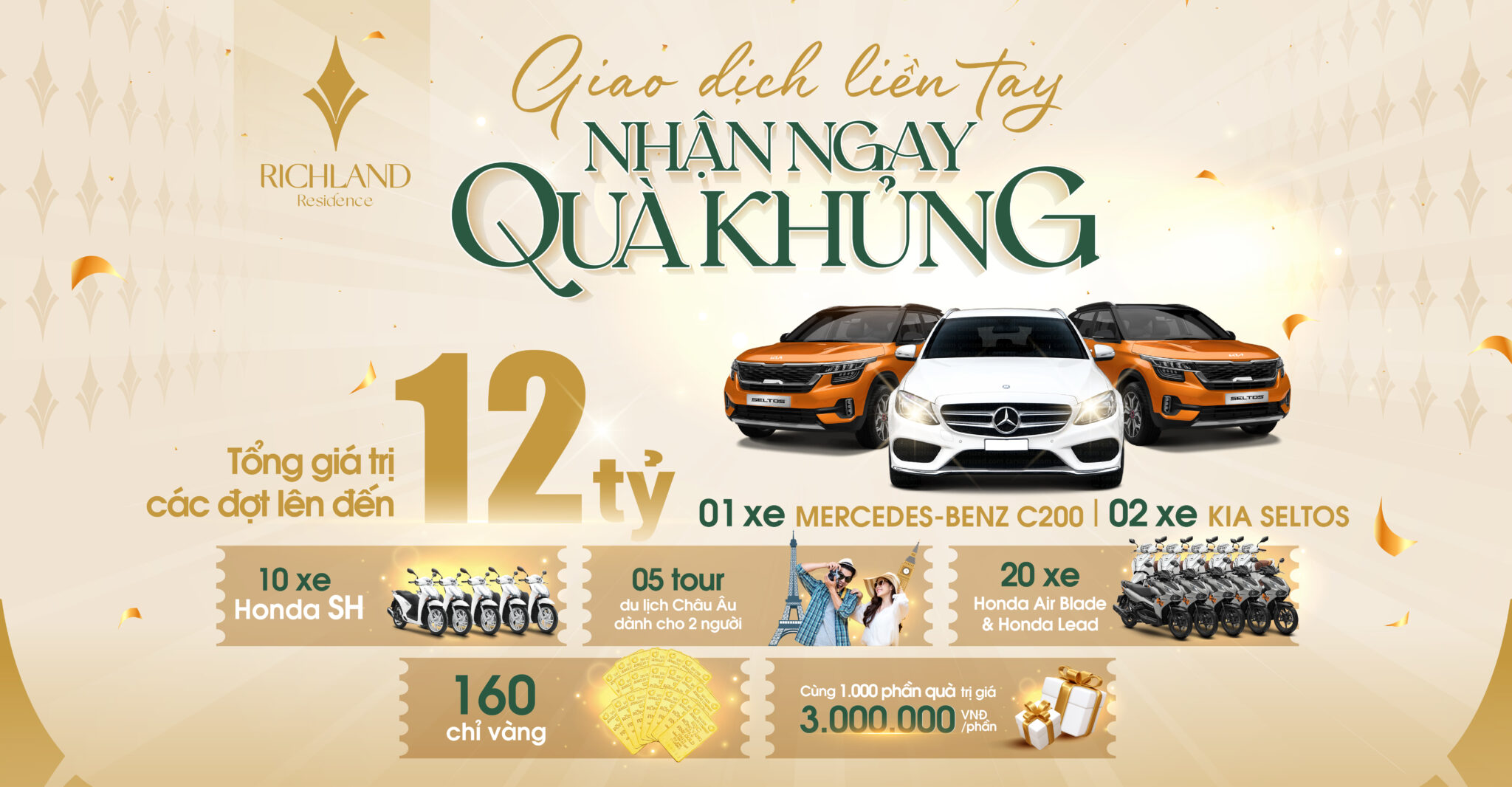 Con số 12 tỷ đồng là giải thưởng mà Chủ Đầu Tư tri ân cho khách hàng giao dịch Richland Residence, ngay khi mở bán xong, sẽ tổ chức sự kiện trang trọng. Các giải thưởng cụ thể: 1 Ô Tô Mercedes C 200, 2 Ô Tô Kia Seltos, 10 xe Honda SH, 20 xe Honda Honda Air bBlade, 5 tour du lịch Châu Âu, 160 Chỉ Vàng, và 1000 phần quà khác.