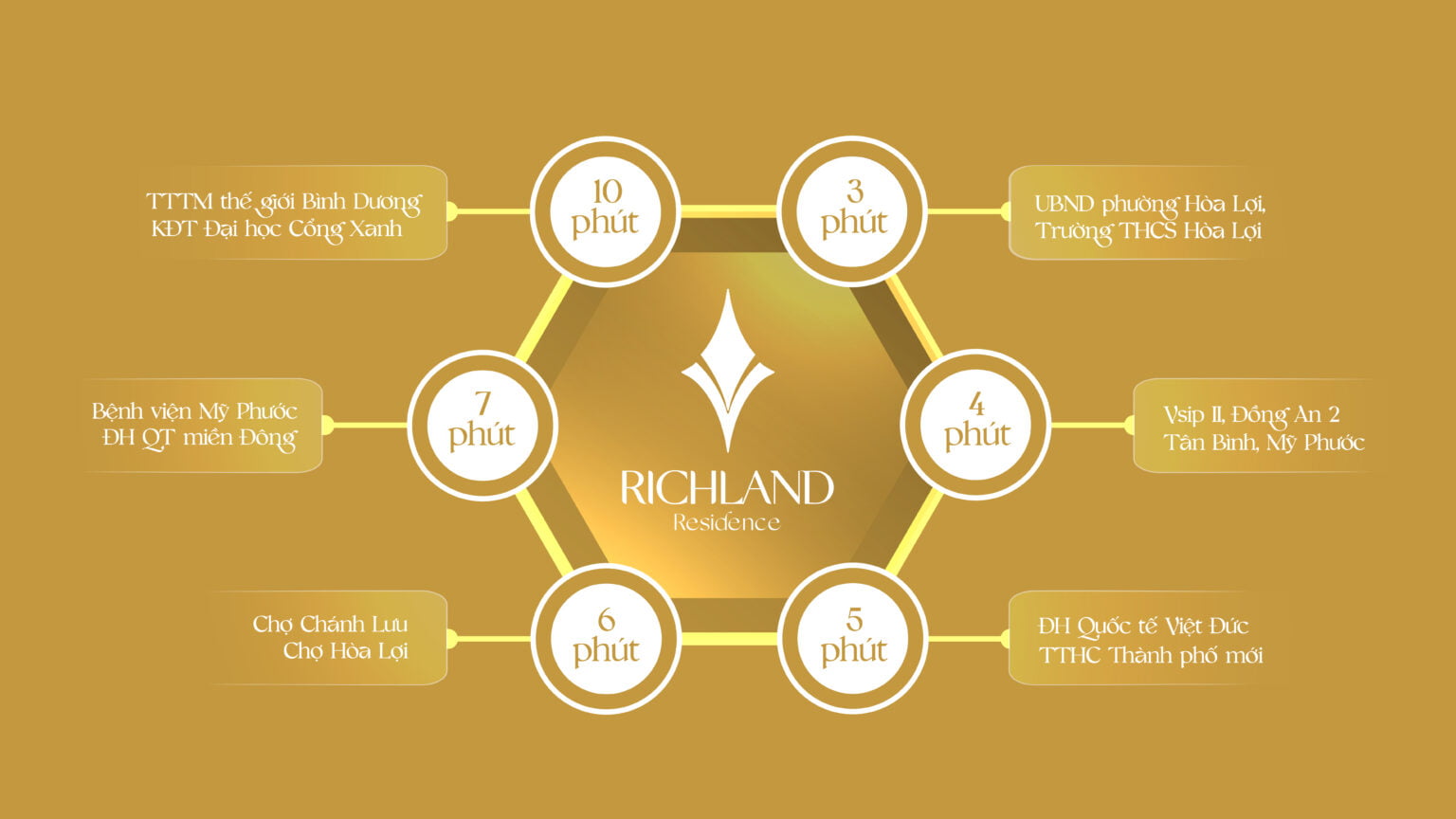 Đặc biệt, trong khoảng 10 phút từ Richland Residence sẽ đến trung tâm thành phố mới Bình Dương, nơi đặt trung tâm hành chính tập trung tỉnh Bình Dương đồng thời hội tụ hệ thống tiện ích đẳng cấp gồm khách sạn 5 sao Becamex, sân golf Twins Dove, Trung tâm Triển lãm – Hội nghị Bình Dương, Trung tâm thương mại thế giới Bình Dương, công viên trung tâm thành phố mới Bình Dương…