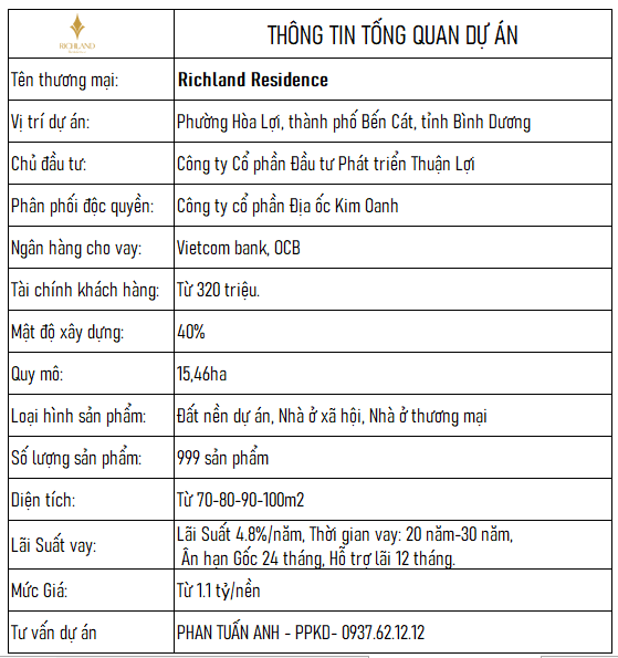 Chào mừng Anh, Chị đến với dự án Richland Residence. Chỉ với 320 triệu, thời điểm này, Khách Hàng có thể lựa chọn Đất Nền, Nhà Phố nằm ngay trung tâm Thành Phố, với hạ tầng cơ bản hoàn thiện, pháp lý chuẩn chỉ.
